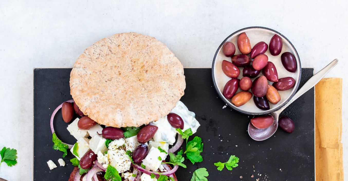 Pâinea pita se unge cu sos tzatziki și apoi se așază alternativ ingredientele pe aceasta. Înainte de servire, se stropește cu ulei de măsline.