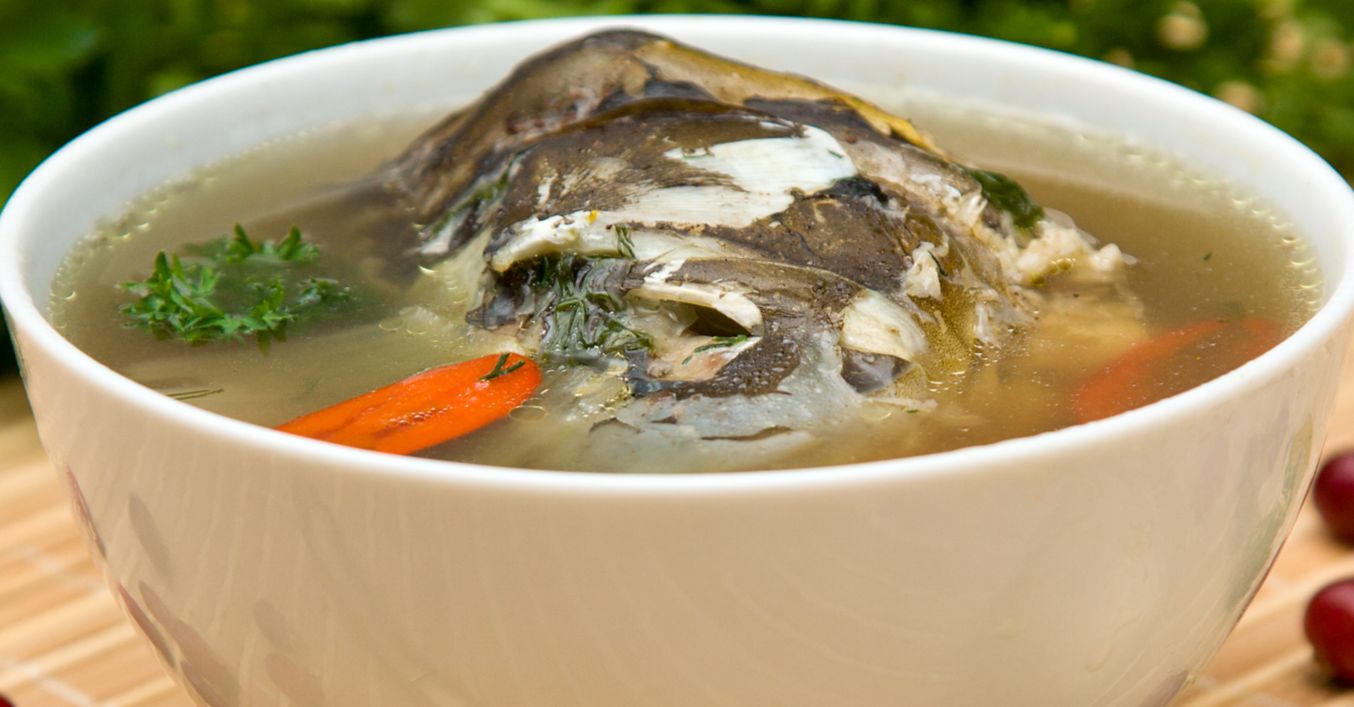 În boluri se așază o bucată de pește, legume și 2 polonice de supă. Se presară mărar verde. Se servește cu crutoane.