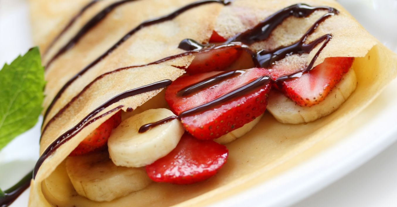 Se umplu clătitele cu fructe și se ornează cu sirop de ciocolată.