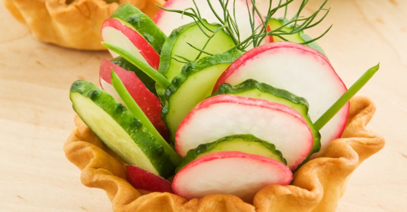 Umplutura: Se spală legumele și se taie rondele. Se presară cu puțină sare și se stropesc cu suc de lămâie. Se umplu coșulețele cu legume și se ornează cu verdeață.