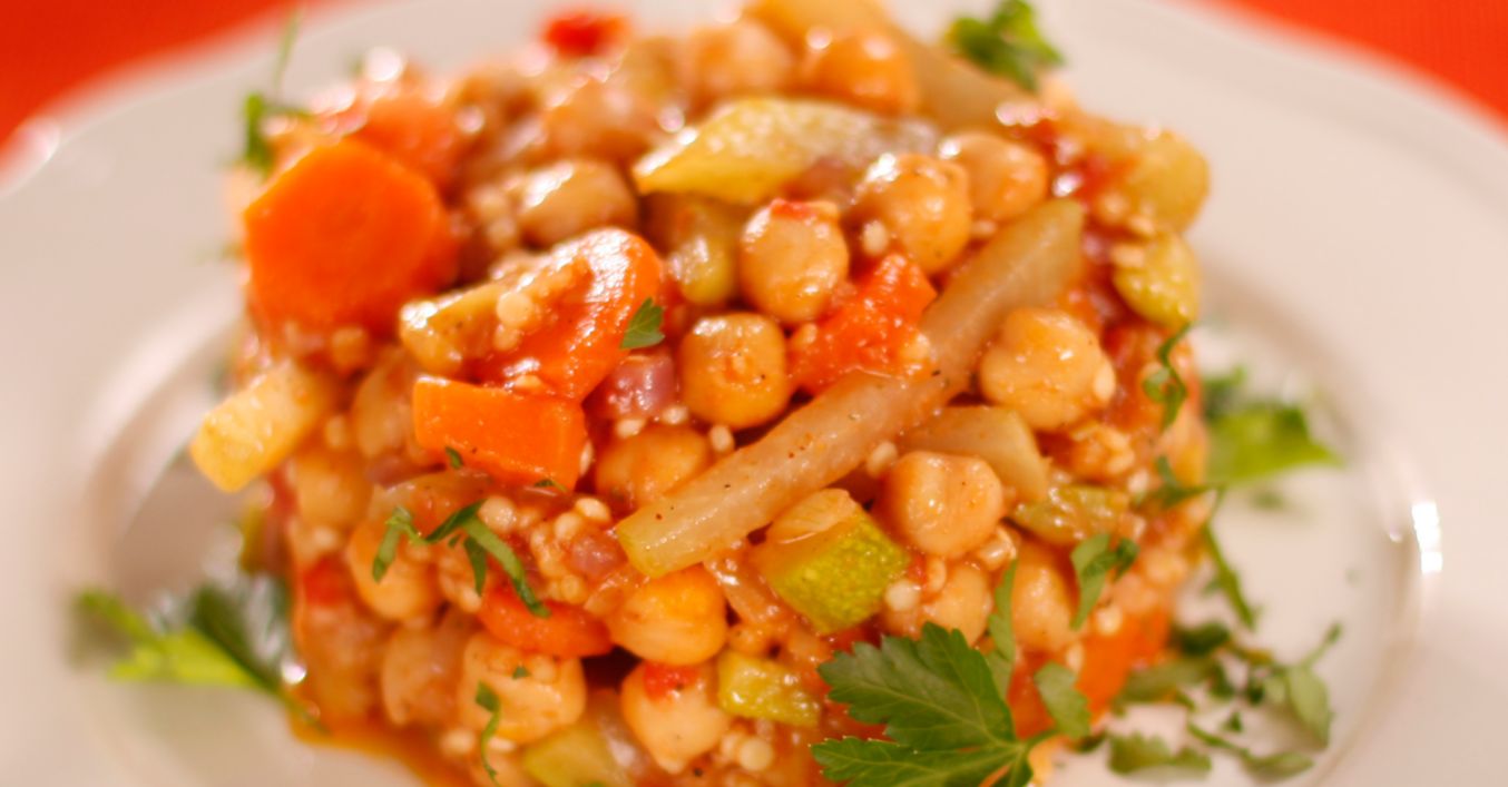 În vasul cu legume fierte, adaugi roşiile în bulion, năutul scurs, sare şi piper după gust. Laşi să mai clocotească împreună 1-2 minute, apoi stingi focul, pui cuşcuşul, usturoiul curăţat şi zdrobit şi, eventual, nucile şi pătrunjelul tocat.