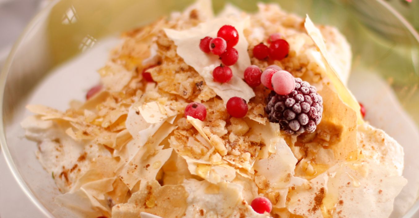 Repartizezi în boluri jumătate din cantitatea de foi coapte. Așezi în straturi crema de brânză și jumătate din foile rămase. Presari deasupra scorțișoară după gust, miez de nucă mărunțit și decorezi cu miere și cu fructe. Păstrezi la rece bolurile cu cremă și ai grijă să le scoți cu ½ oră înainte de a consuma desertul.