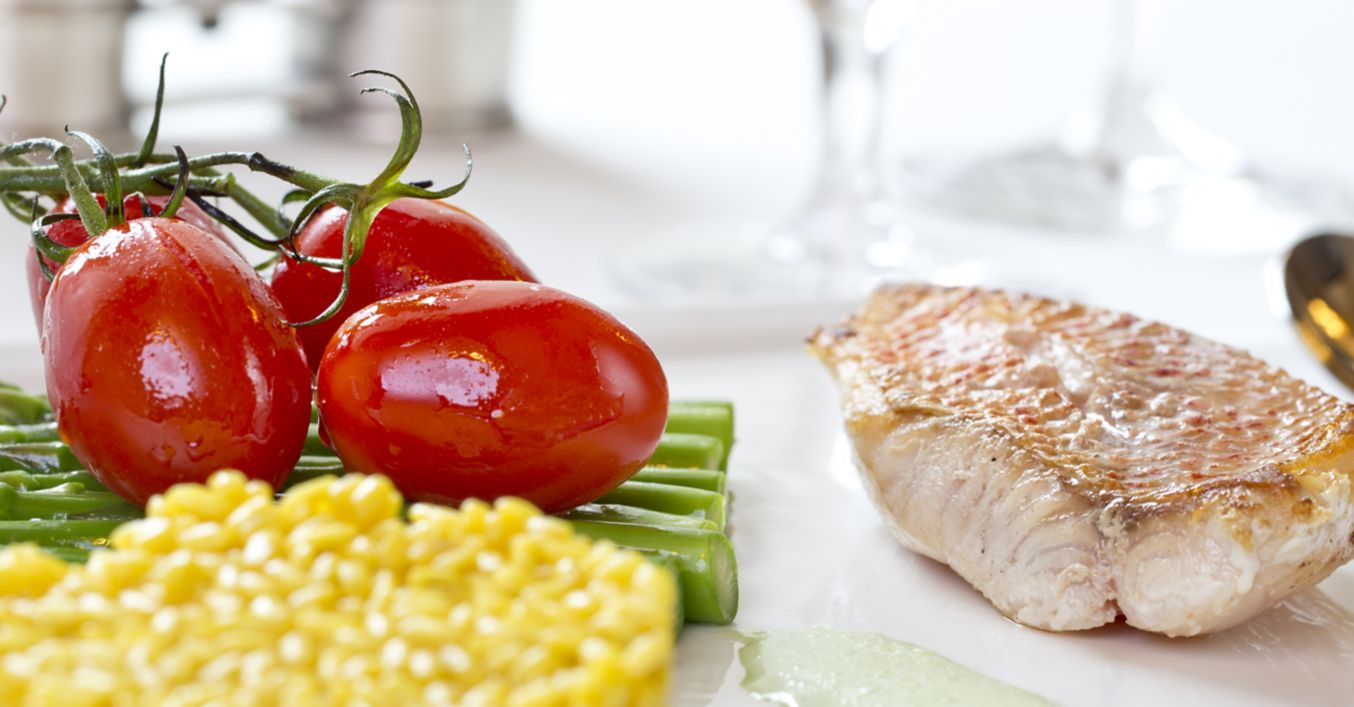 Se montează farfuriile. Se răstoarnă câte o porție de orez, se pun fire de sparanghel, roșii proaspete și o bucată de pește.