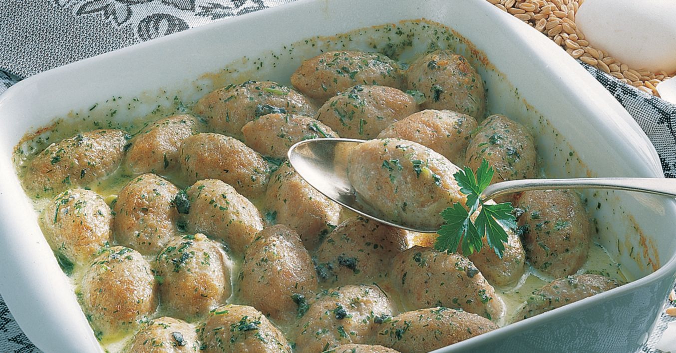 Se dă în clocot grișul cu apă și se fierbe la foc mic 20 de minute. Se adaugă făină, ouă, smântână, cca. două treimi din verdețuri, sare, piper și nucșoară; se amestecă până se obține un aluat moale, dar modelabil.