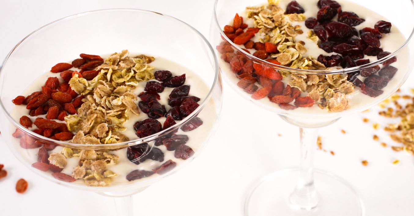 Se transferă iaurtul din borcan în paharele din care se va servi și se decorează cu goji, merișoare si fulgi de ovăz.