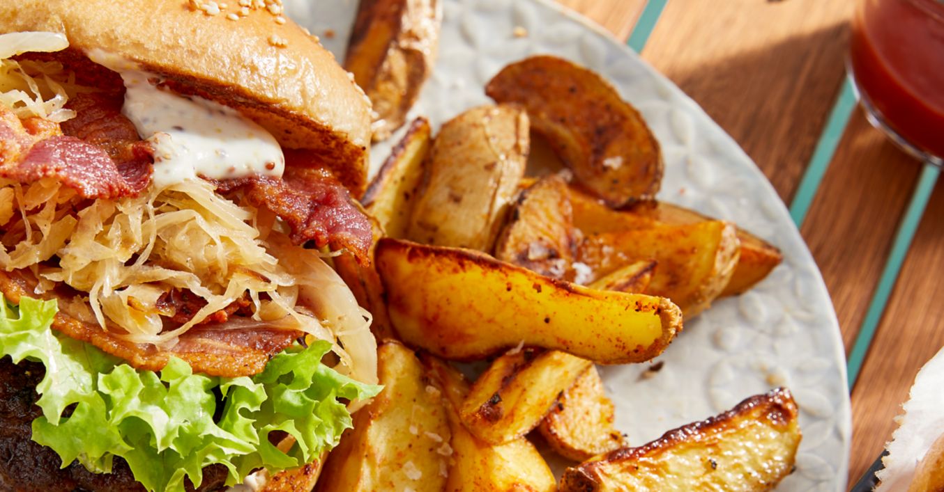 Între timp, maioneza se amestecă cu muștarul și se ung părțile tăiate ale chiflei cu acest amestec. Pe partea de jos a chiflei se pune salata, chifteaua, baconul și varza murată și deasupra se pune partea de sus a chiflei. Se servește cu feliile de cartofi.