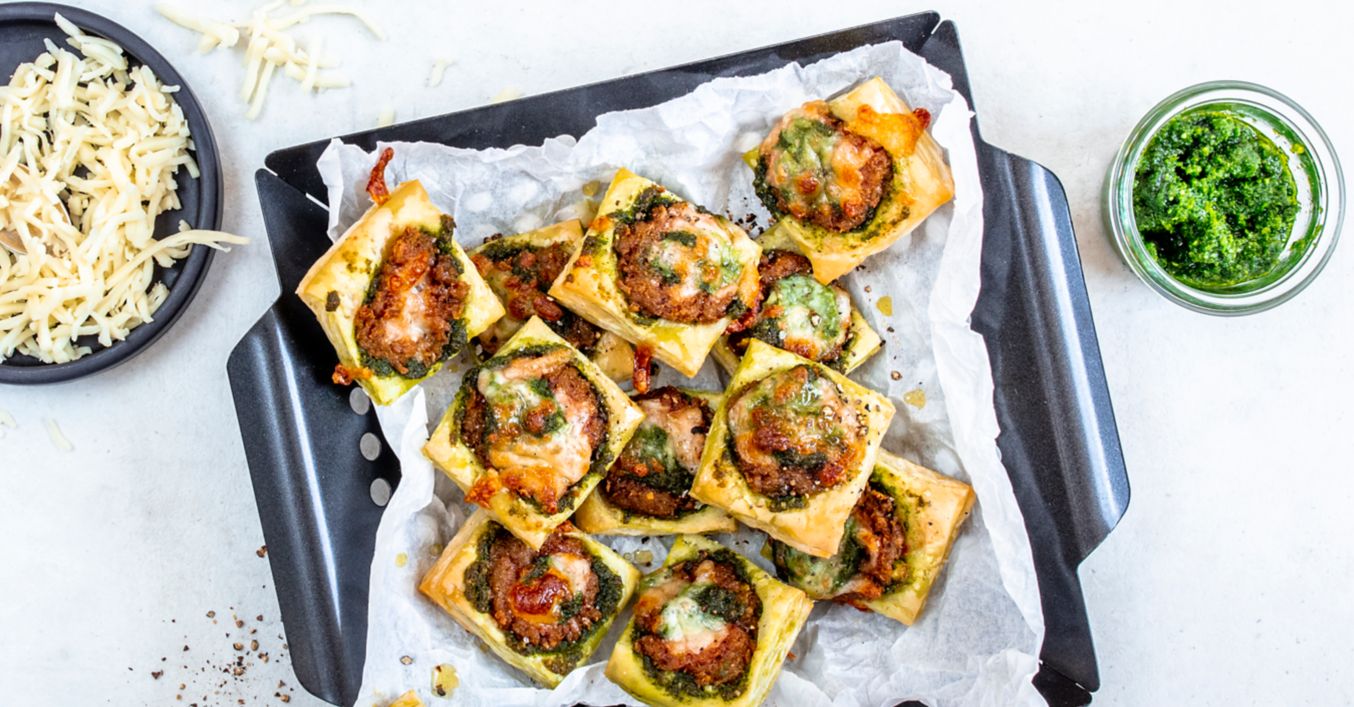 Se unge aluatul cu pesto, se distribuie bilele pe acesta și se presară cu mozzarella. În final, bucățile de mini-pizza se coc aproximativ 12 minute pe șina mediană a cuptorului, până se rumenesc.