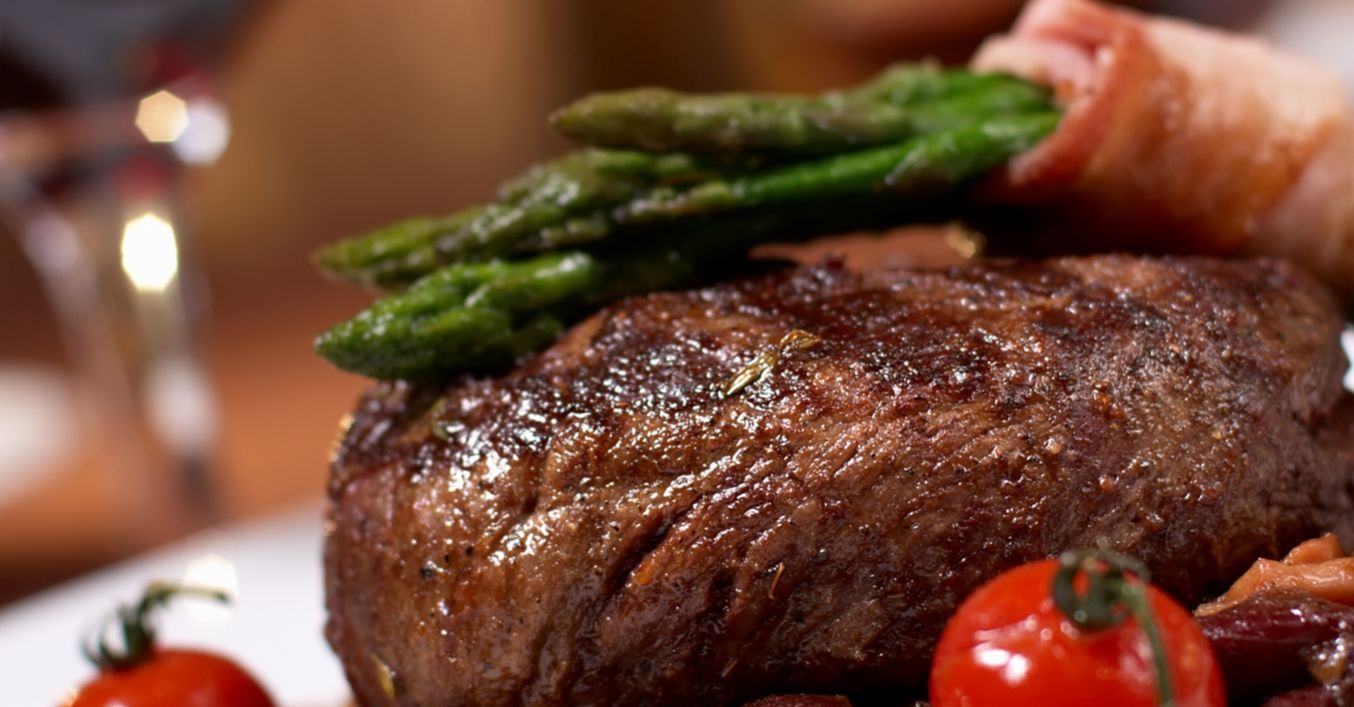 Se porționează vita și se presară cu piper. Se frige pe grătar, o dată cu sparanghelul și roșiile întregi. Se iau câte 4 fire de sparanghel și se rulează într-o felie de bacon.