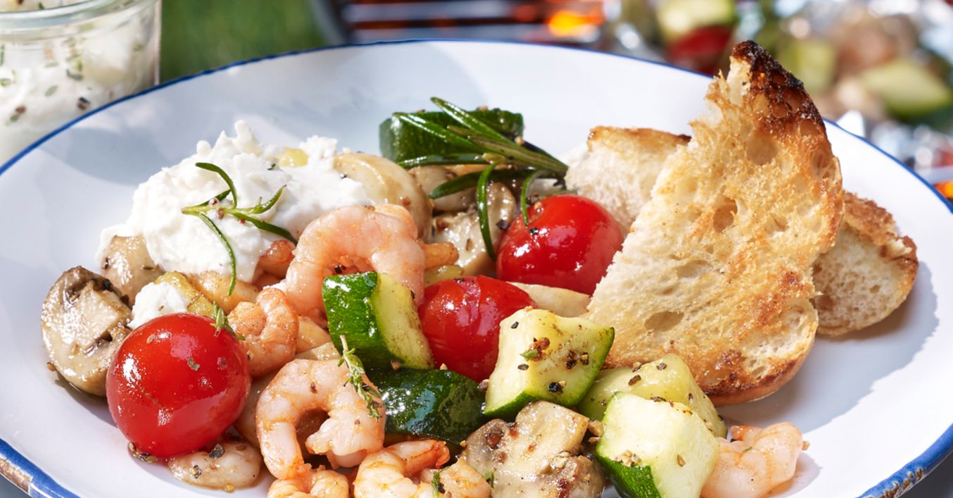 Se amestecă crevetele, zucchini, ciupercile, roșiile și uleiul, se condimentează cu sare și piper și se distribuie cu câte o rămurea de ierburi, pe 4 bucăți de folie de aluminiu. Se împăturește folia pentru închidere.