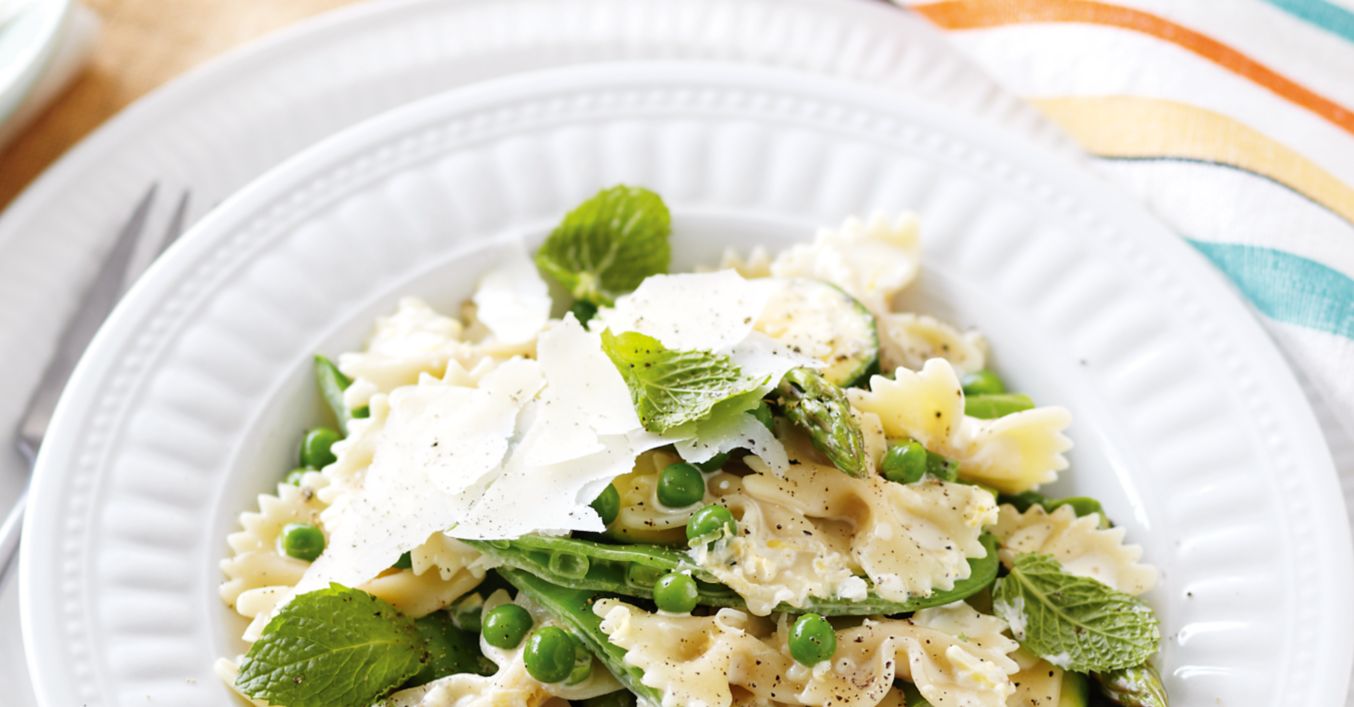 Între timp, se dă în clocot apă într-o altă cratiță. Se pun sparanghelul, mazărea dezghețată, zucchini tăiat felii și se fierb 1 minut. Se adaugă mazărea mangetout și se mai fierb 1 minut. Se scurg și se reîmprospătează legumele sub jet de apă rece, ca să-și păstreze culoarea. Se scurg bine.