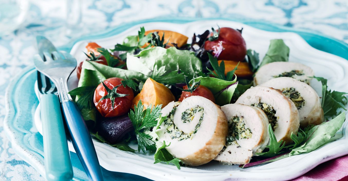Se taie pe jumătate piepții de pui, orizontal, și se aplatizează pentru a ajunge la o grosime uniformă de 1 cm. Se pun 2 linguri de amestec de ierburi pe o bucată de carne și se rulează începând de la capătul îngust. Dacă se dorește, se așază ruloul pe o bucată de prosciutto. Se înfășoară și aceasta. Se leagă ruloul cu sfoară de bucătărie și se repetă operațiunile cu restul de ingrediente.