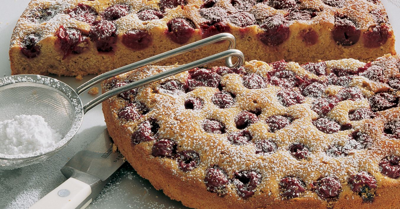 Se unge forma. Se netezește aluatul în formă și se presară vișinele deasupra. Se coace prăjitura circa 50 de minute la cuptor. Se scoate și se lasă 10 minute în formă. Apoi se desprinde prăjitura din formă și se lasă să se răcească pe un grătar pentru prăjituri. Se presară cu zahăr pudră.