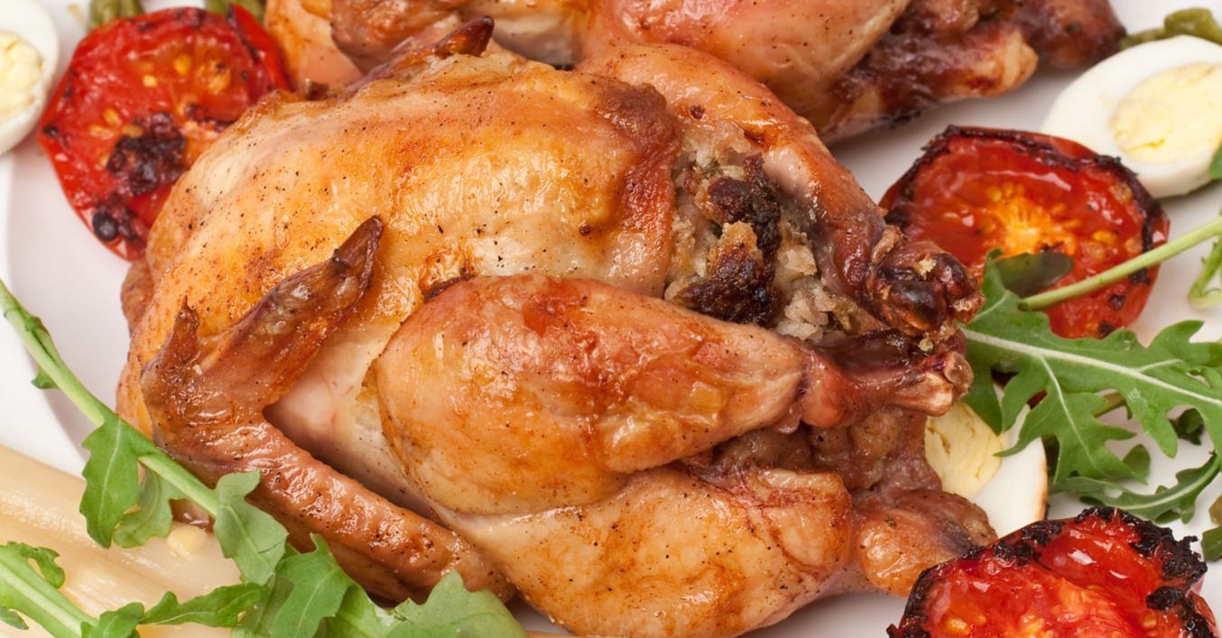 Se pun puii pe platou și se ornează cu legumele preparate pe grătar.