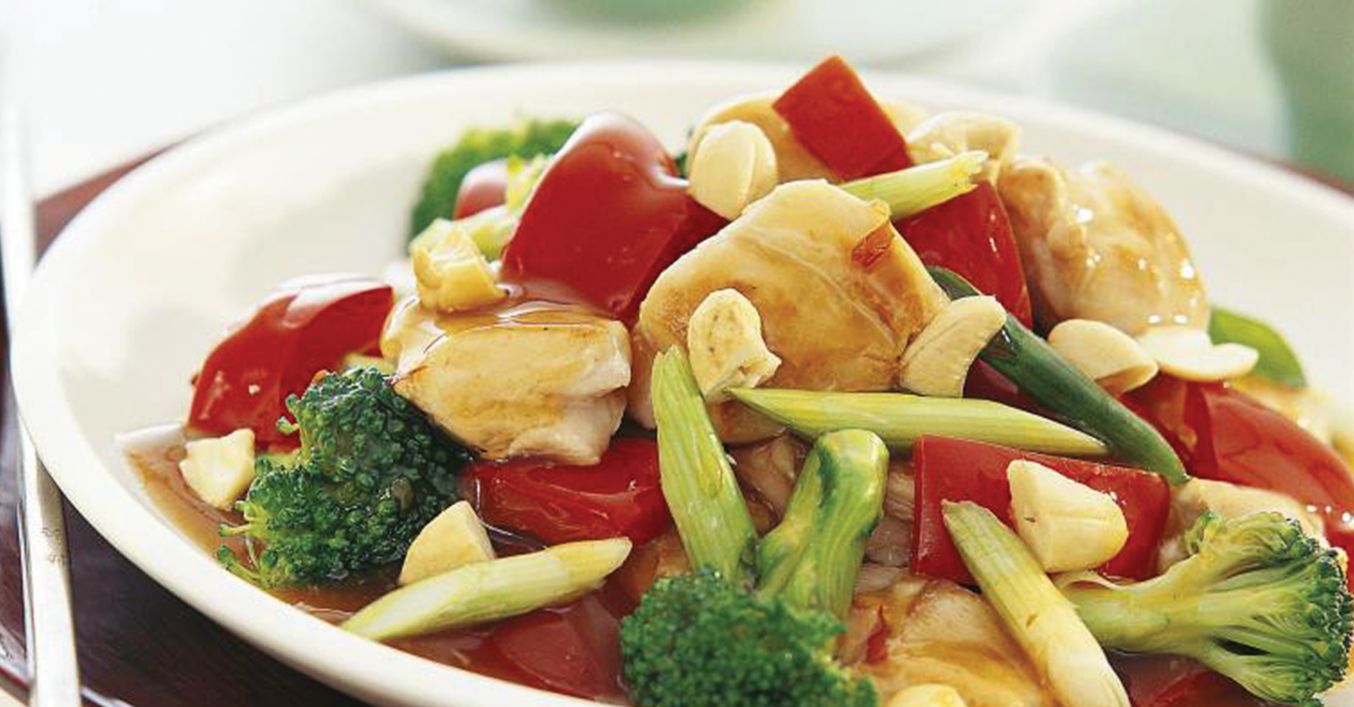 Se pun în wok ghimbirul și usturoiul și se gătesc 30 de secunde. Se adaugă broccoli și ardeiul gras; se continuă 2 minute. Se toarnă în wok supa-bază și sosul de ardei iute și se dă în clocot. Se combină amidonul cu 1 lingură de apă, pentru a se obține o pastă omogenă; se adaugă în compoziție și se amestecă 1 minut sau până când sosul este ușor îngroșat. Se aduc din nou bucățile de pui în wok, se adaugă ceapa verde și se amestecă, pe foc, 1 minut. Chiar înainte de a servi preparatul, se presară deasupra alunele caju, tocate mare.
