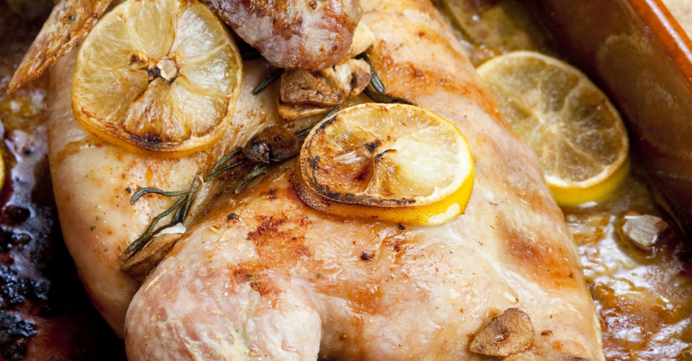 Lămâia se spală bine, apoi se taie felii și se pun peste pui, în tavă. Se presară rozmarin, se acoperă tava cu folie de aluminiu și se dă la cuptor. Se întoarce puiul pe toate părțile pentru a se rumeni uniform.