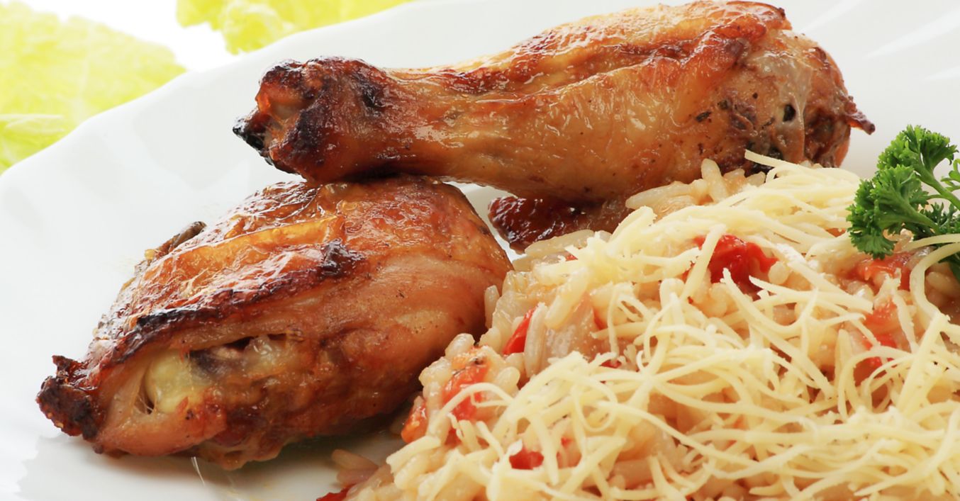Se montează porțiile. Se pun pe farfurie 2 bucățele de pui , se adaugă garnitura de orez și se presară varza chinezească tăiată fideluță.