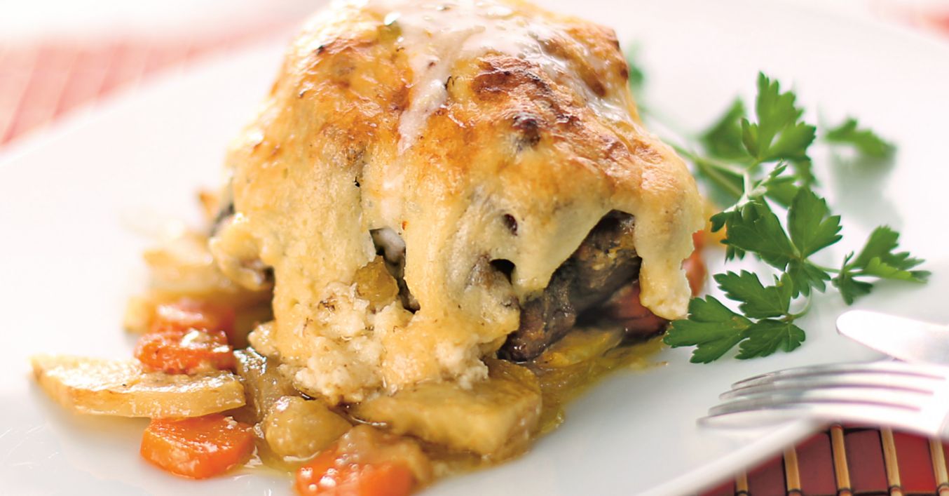 Pulpa de vită o împănezi cu felioare de slănină, o sărezi și piperezi după gust și o așezi într-o tavă. Adaugi rondele de morcov, rondele de ceapă, bucăți de țelină, felii de rădăcină de pătrunjel, apă și 3 linguri cu unt.