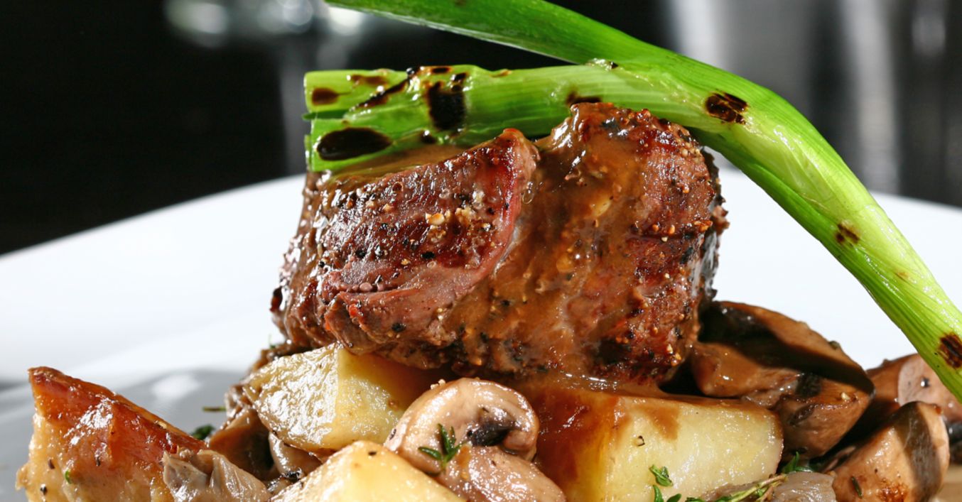 Se servește rasolul cu garnitură de ciuperci și se ornează cu ceapă verde coaptă pe grătar.