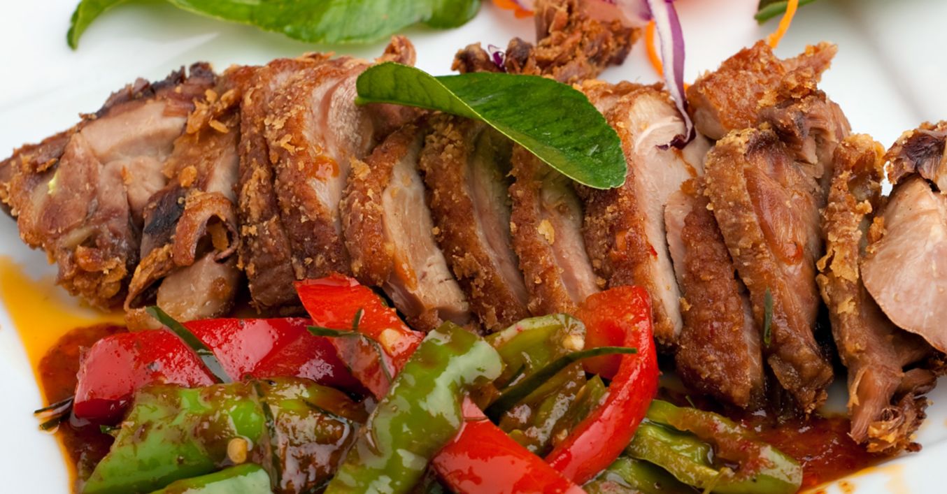 Se taie pieptul de rață în felii subțiri. Se ung cu ulei de măsline și se presară cu sare și piper. Se frig pe plită bine încinsă.