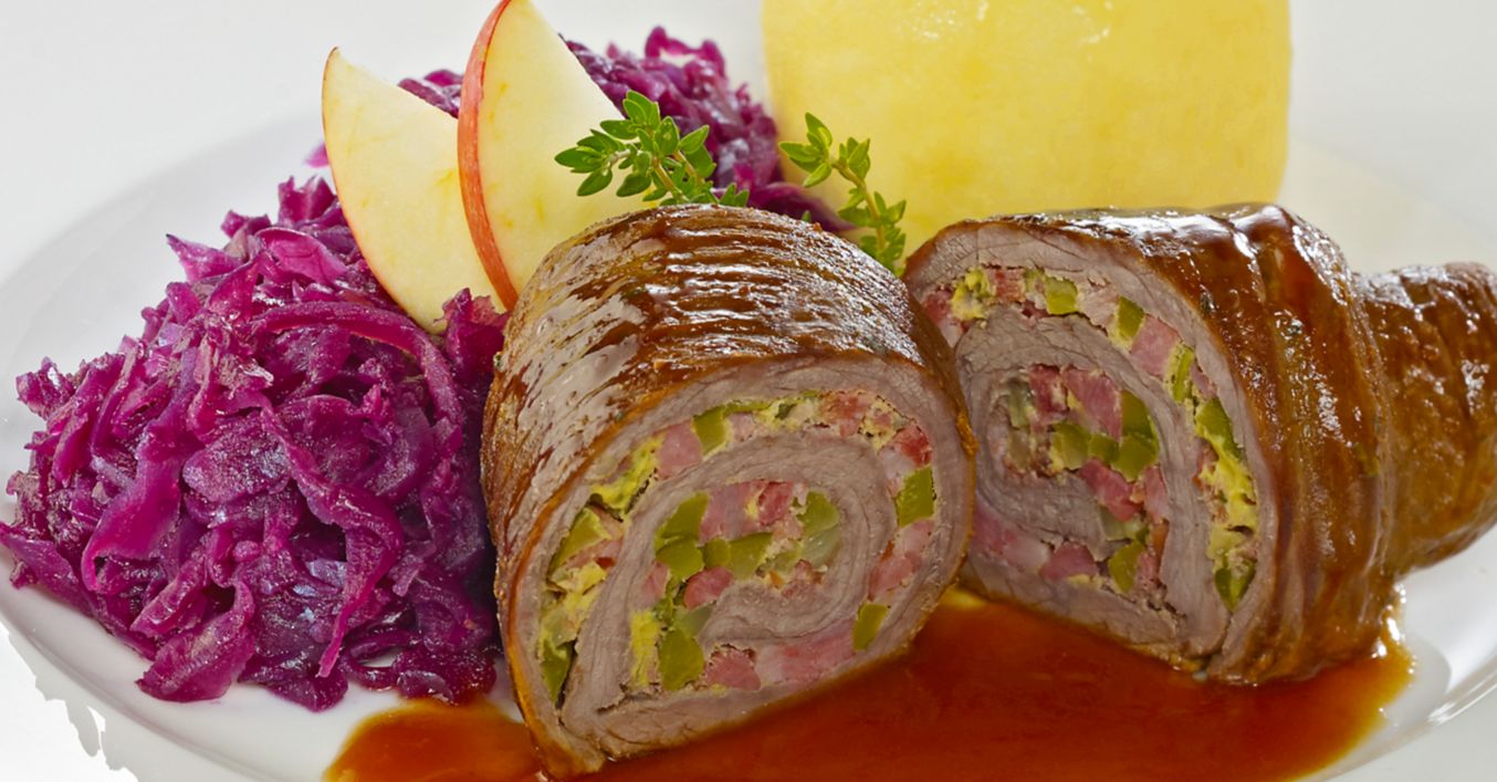 Sosul și ruladele se așază într-o farfurie și se pot servi cu varză roșie și găluște. Se ornează cu felii de mere și ierburi, după gust.