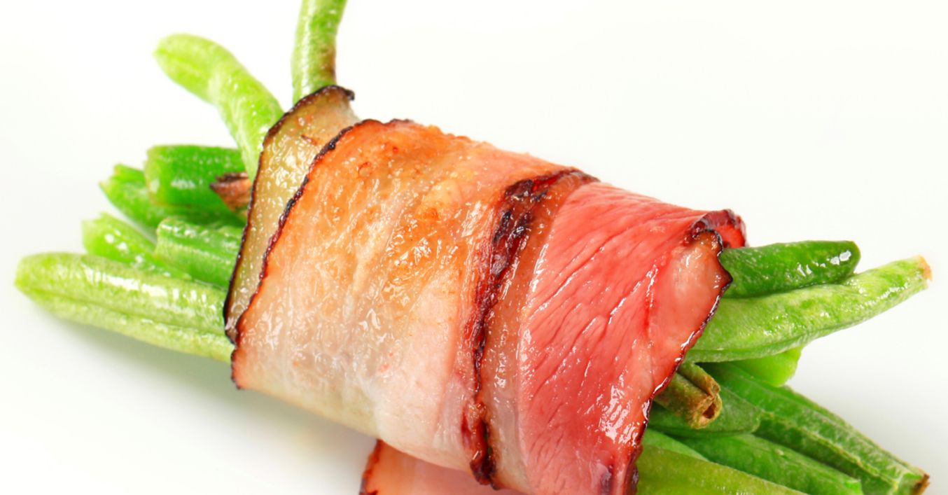 Pe fiecare felie de bacon se pun câteva teci și se rulează. Se aranjează pe platou.