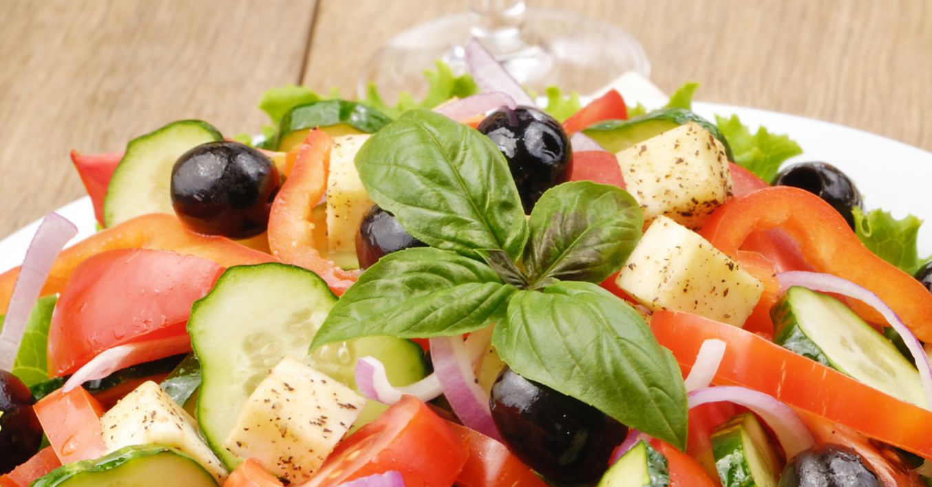 Se montează farfuriile. Se pune un pat din frunze de salată pe care se adaugă felii de roșii, rondele de castravete, fâșii de ceapă, măsline și cuburi de brânză.