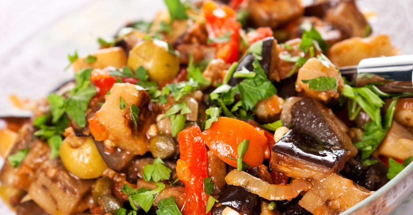 Se încing 4 linguri de ulei, într-o cratiță înaltă. Se prăjește ceapa 1 minut, după care se adaugă vinetele. Se prăjesc 2, 3 minute și se adaugă ardeii copți și măslinele. Se pune sare și piper după gust și se toarnă sucul de roșii.