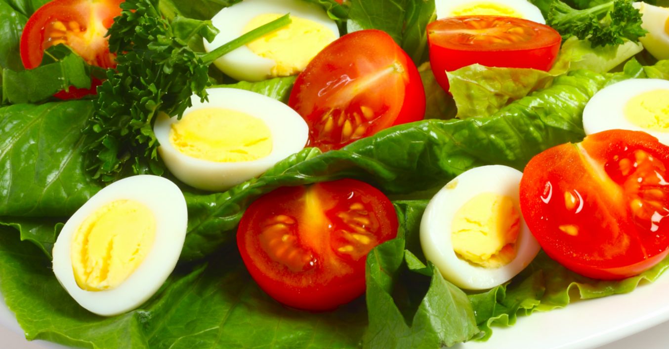 Se montează un pat din frunze de salată, pe un platou. Se adaugă roșiile tăiate jumătăți și ouăle fierte tăiate rondele.