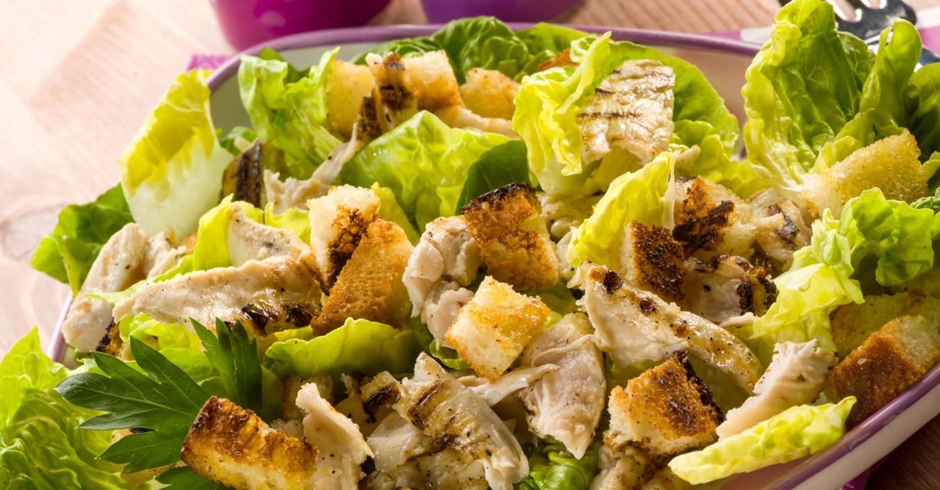 Se rup frunzele de salată, se stropesc cu ulei de măsline și se presară cu sare și piper. Se pun în două farfurii și se adaugă crutoane și bucăți de piept de pui. Se stropește totul cu suc de lămâie.