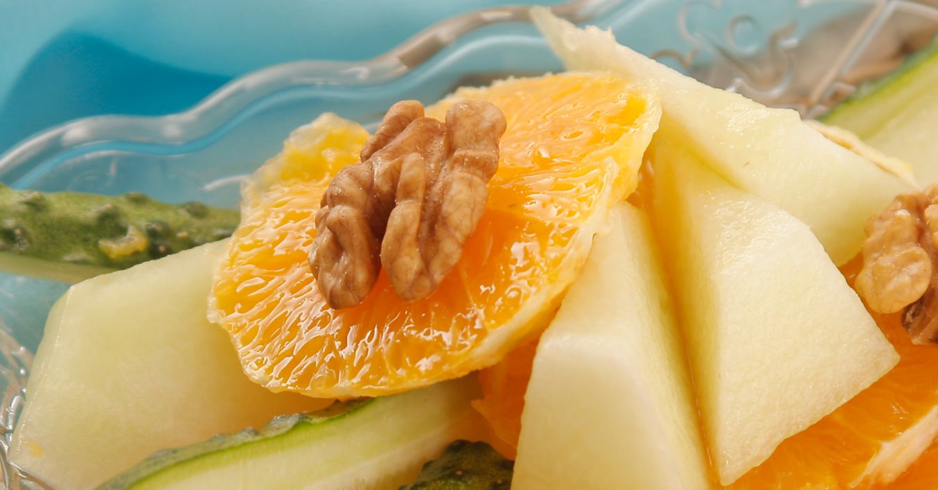 Speli castraveții, îi tai în jumătate pe lungime și le îndepărtezi semințele. Procedezi la fel cu pepenele galben. Decojești portocala și o desfaci în felii. Tai în cuburi castraveții, portocala și pepenele. Dacă ai îndemânare, în loc să tai pepenele în cuburi, pentru un aspect mai plăcut poți să scoți semisfere din miezul de pepene, folosind o linguriță.