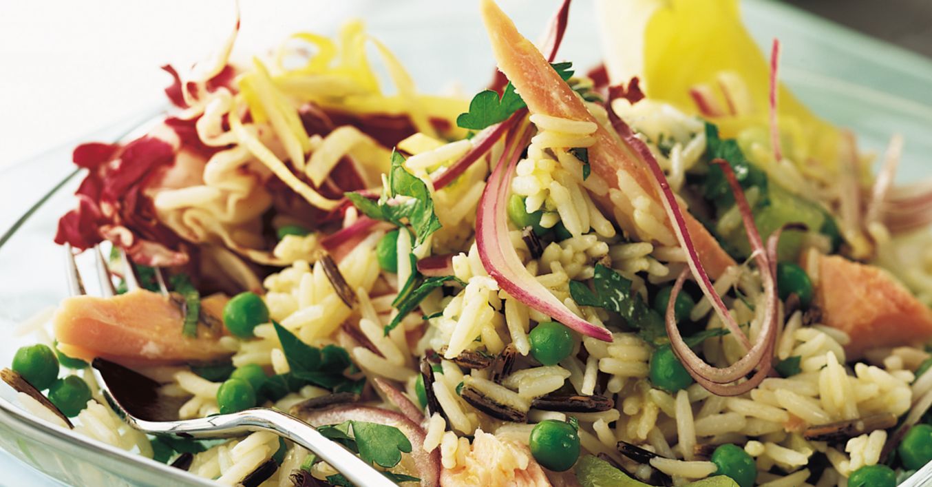 Se pune orezul într-o oală, iar peste el se toarnă apa clocotită. Se dă în clocot, apoi se micșorează flacăra, se acoperă oala și se fierbe încet, circa 15 minute, sau conform instrucțiunilor de pe ambalaj, până ce orezul este fraged și toată apa a fost absorbită. Se transferă orezul într-un castron mare și se amestecă cu mazărea; se lasă apoi să se răcească.
