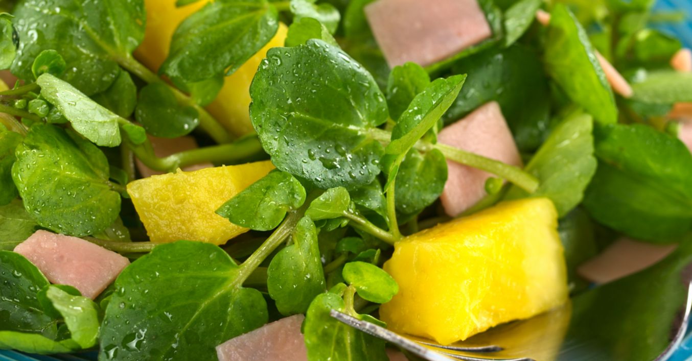 Se curățiă ananasul și se taie cuburi . Se pune într-un bol împreună cu frunzele de untișor și șunca tăiată cuburi.