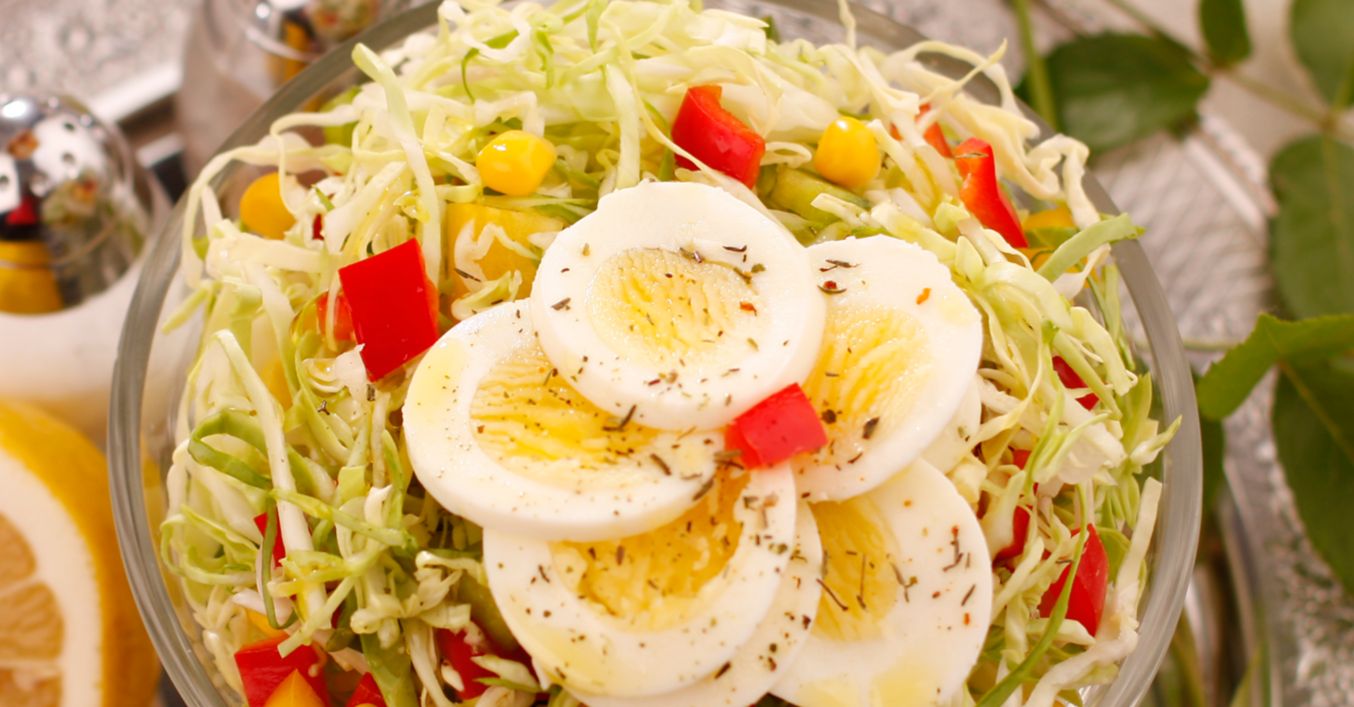 Speli varza și o tai fideluță. Speli ardeii și îi cureți, apoi îi tai în cuburi sau fâșii. Fierbi ouăle tari, apoi le dai pe răzătoare sau le tai în felii subțiri, cu dispozitivul special. Cureți ceapa verde, o speli și o tai mărunt.