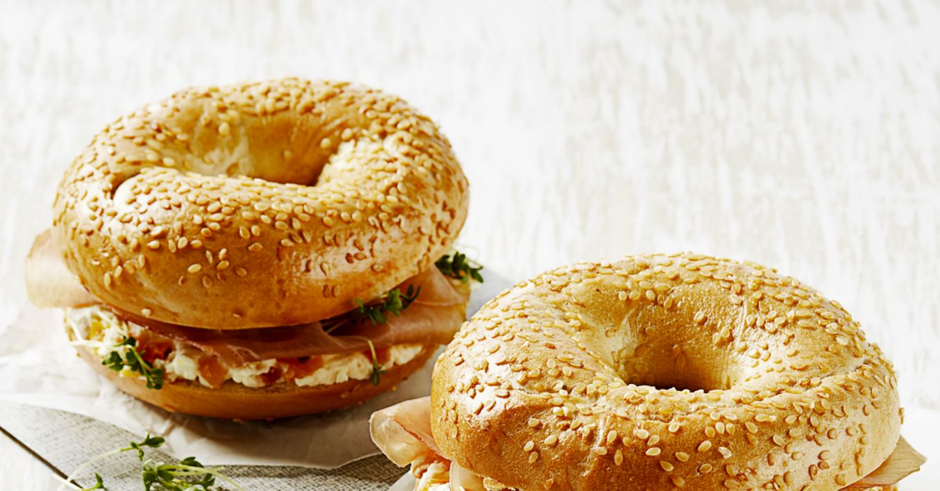 Bucățile de jos ale chiflei se ung cu smântâna cu caise și se așază felii de șuncă pe acestea.