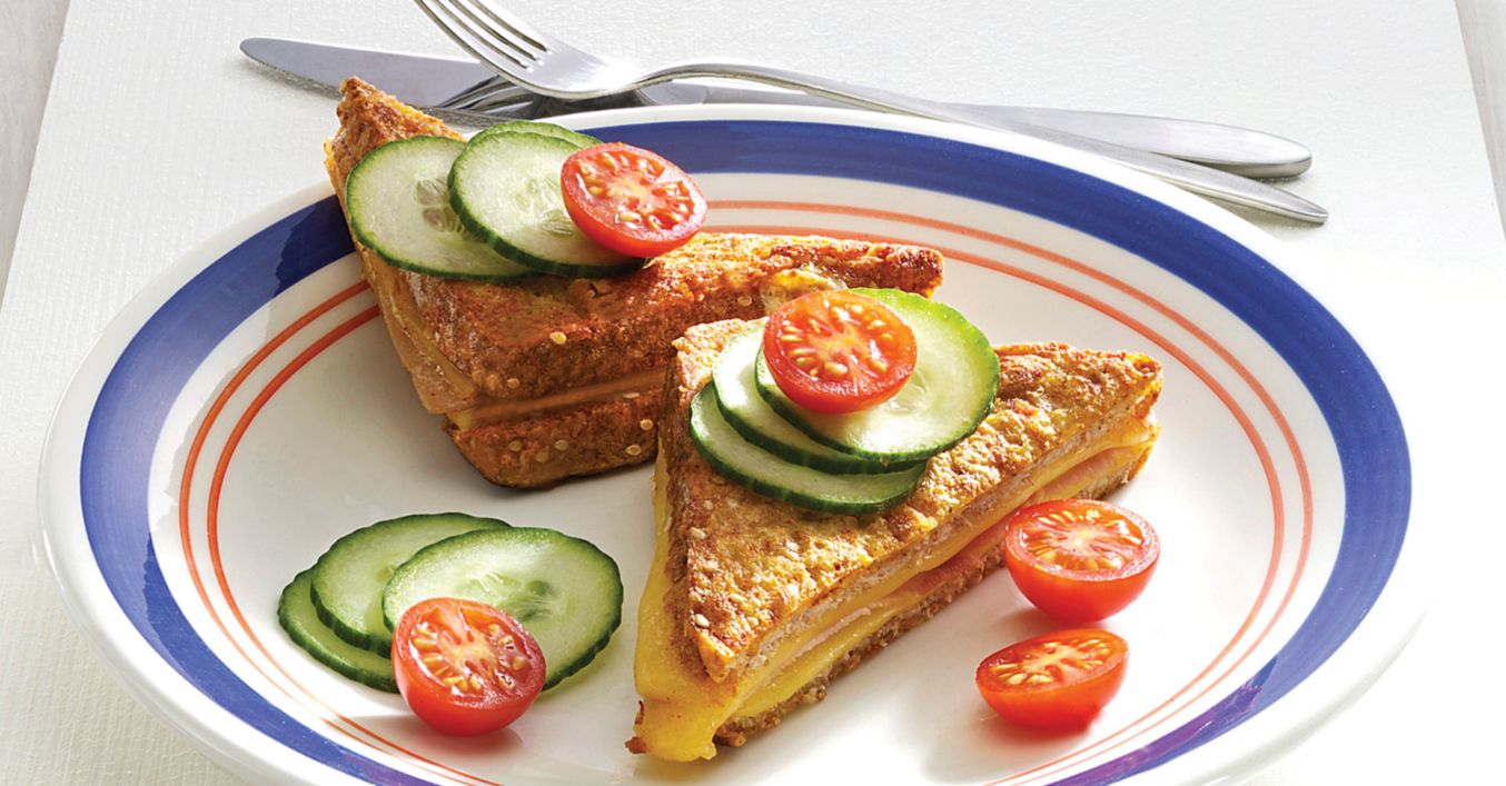 Se scot sandviciurile, se lasă la scurs pe șervete de bucătărie; se taie sandviciurile în câte două triunghiuri. Se pun câte două triunghiuri pe câte o farfurie încălzită. Se garnisesc cu felii de castravete și jumătăți de roșii; se servesc imediat.