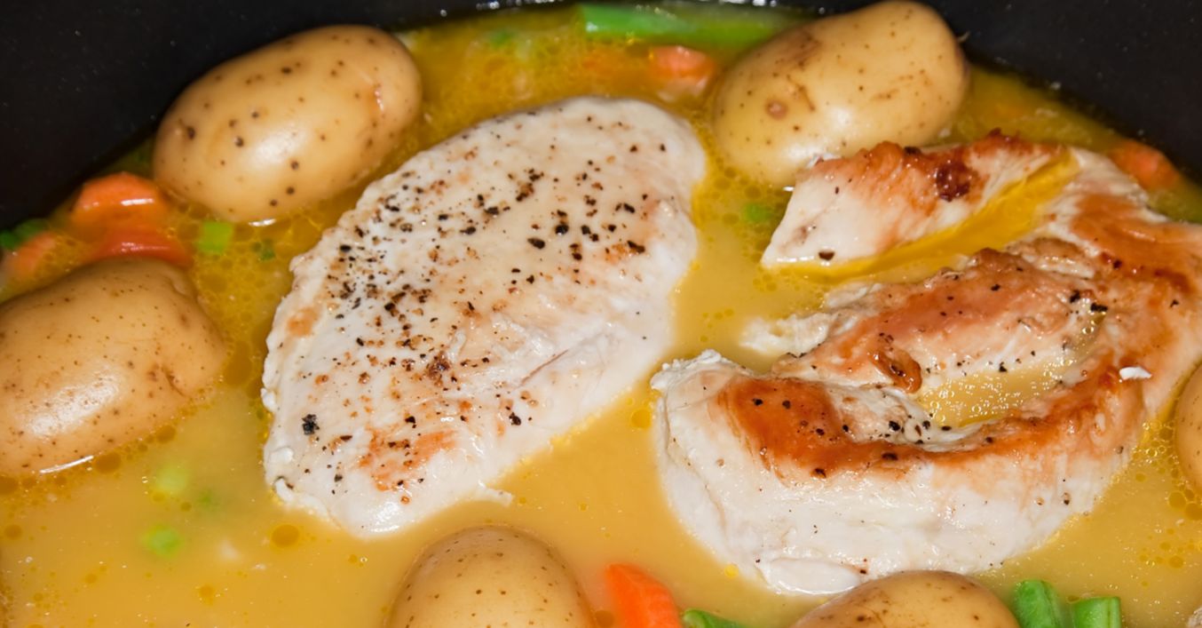 Se curăță ceapa și morcovii. Ceapa se toacă mărunt, iar morcovii se taie rondele. Cartofii se lasă în coajă, dar se spală foarte bine. Se porționează pieptul de pui, dar nu în bucăți foarte mici.
