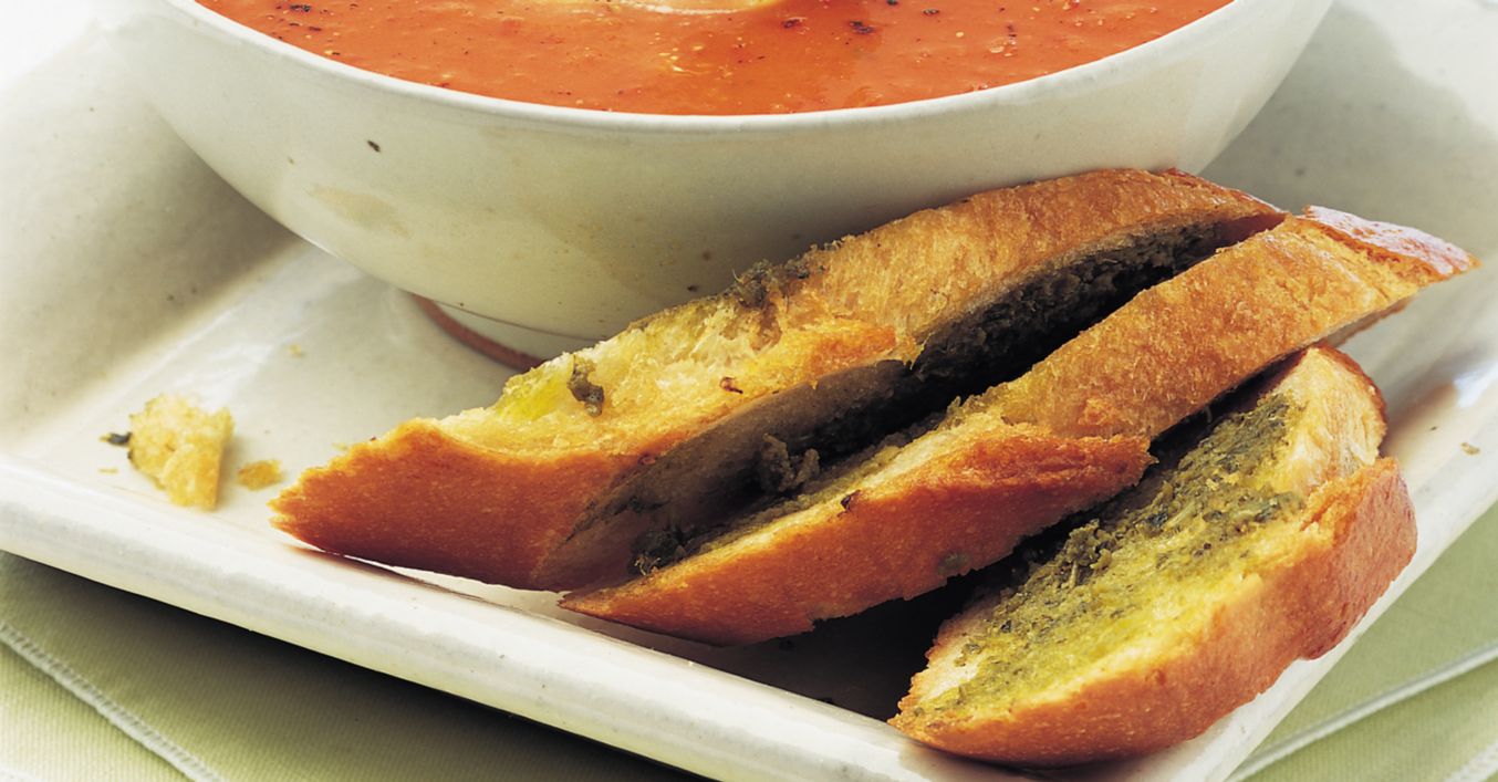 Se pune pâinea în cuptor timp de 15 minute. Între timp, supa se pasează într-un robot de bucătărie până se uniformizează. Se pune supa înapoi în cratiță, se adaugă roşiile pasate, cimbrul, scorțișoara și zahărul. Se încălzește supa încet fără să fiarbă. Se adaugă sare și piper după gust.
