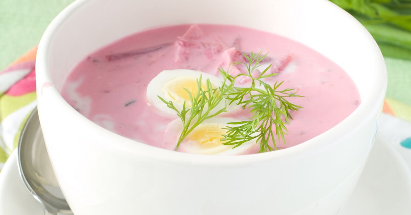 Supa se servește imediat, rece, ornată cu jumătăți de ou și crenguțe de mărar.