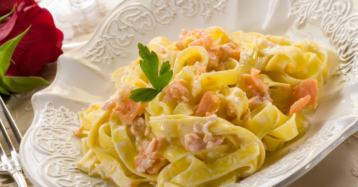 Se amestecă smântâna cu gălbenușurile. Se adaugă un praf de sare și piper și se toarnă peste untul încins într-o crăticioară. Se fierbe 2 minute și se adaugă somonul tăiat cuburi. Se ia de pe foc și se amestecă ușor cu pastele.