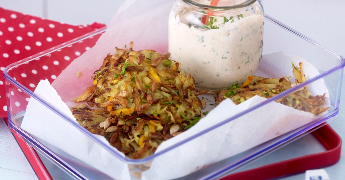 Frecaţi brânza quark cu verdeţurile şi asezonaţi cu sare, piper şi boia. Pentru a le lua la pachet, ambalaţi turtiţele Rösti împreună cu brânza quark cu verdeţuri într-o caserolă.