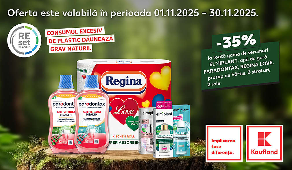 La fiecare 3 recipiente de plastic aferente produselor cosmetice și de curățenie* pe care le lași în broscuța noastră în perioada 1 - 30 noiembrie 2025, îți oferim 35% reducere la toată gama de serumuri Elmiplant, apă de gură Parodontax, Regina Love, Prosop de hârtie, 3 straturi, 2 role și Somat Excellence 5in1 / 4in1, Capsule pentru mașina de spălat vase, 42 buc / 50 buc.