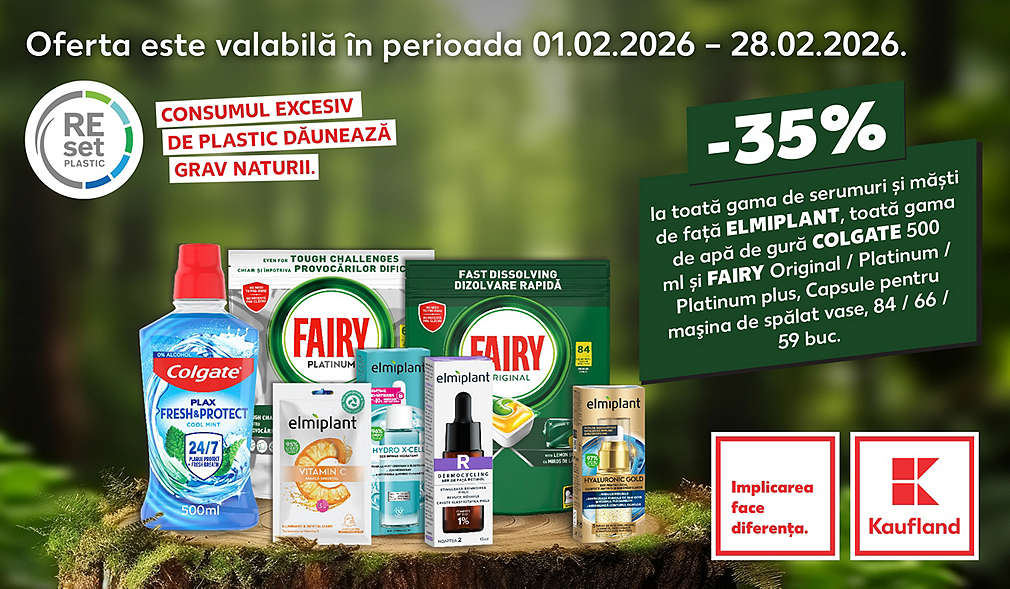 La fiecare 3 recipiente de plastic aferente produselor cosmetice și de curățenie* pe care le lași în broscuța noastră în perioada 1 - 28 februarie 2026, îți oferim 35% reducere la toată gama de serumuri și măști de față Elmiplant, toată gama de apa de gură Colgate 500 ml și Fairy Original / Platinum / Platinum plus, Capsule pentru maşina de spălat vase, 84 / 66 / 59 buc.